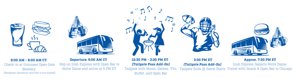 The Complete Game Day Experience from Chicago to Notre Dame. We serve Fighting Irish and visiting fans alike, delivering the very best Gameday experiences for those traveling from Chicago. Irish Express is the most convenient and luxurious round-trip option on game days.